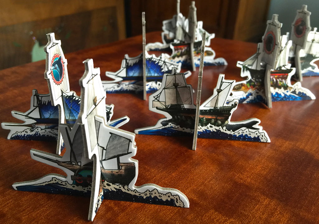 - 8 sagome di cartone spesso, che servono a comporre il galeone personale di ogni giocatore; queste si utilizzano soltanto quando si gioca nella modalità multiplayer con uno smartphone solo a disposizione di tutti.