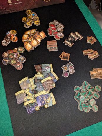 L’apertura della scatola non delude le altissime aspettative, se non (stranamente) per le basette delle miniature, rimaste fedeli alla vecchia edizione e semplicemente troppo grandi e “coprenti”. Il resto è allo stato dell’arte, anche se le miniature hanno un livello di dettaglio buono, ma lontano dai livelli delle miniature del mercato specialistico. Incredibilmente belle le tessere che compongono la mappa, eccellente la grafica (come sempre per i titoli Fantasy Flight Games).