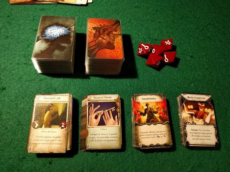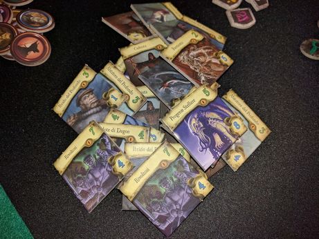 Poi dovrete svolgere le prove di orrore, tipicamente usando la vostra Volontà: ogni giocatore ne effettua una sola, usando come riferimento il mostro più orrendo (una semplificazione tutto sommato intelligente). A questo punto la fase dei miti finisce, e inizia un nuovo turno (se il tempo a disposizione non è finito). Come sempre, esaurire i punti vita o i punti sanità mentale è deleterio: la prima volta che esaurite i primi pescherete una carta ferita, la seconda morirete. Analogamente, la prima volta che esaurite i punti sanità mentale impazzirete, ma questa volta pescherete un carta apposita, i cui effetti saranno segreti e noti soltanto a voi. Potreste diventare cleptomane o piromane o chissà che altro. Gli altri si accorgeranno della patologia solo dagli effetti… e non sarà quasi mai piacevole. Si noti che la morte di un investigatore determina la fine della partita dopo un ultimo turno svolto dai giocatori rimasti: questo significa quasi sempre una sconfitta per tutti. I giocatori sono così obbligati a cooperare al massimo, usando i rari medicinali e poteri curativi anche in modo “altruistico”.