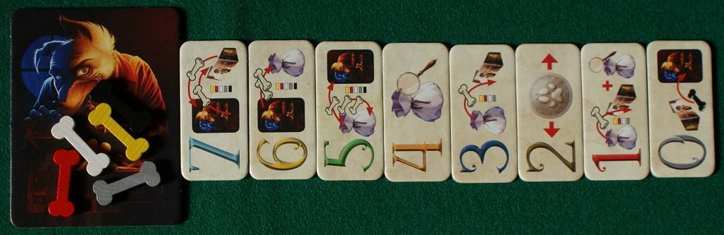 Come si vede nella foto qui sopra ogni tessera è caratterizzata da un numero (da “0” a “7”) e da un bonus specifico, indicato da delle icone e dei simboli. Il numero indica quanti ossi il giocatore si propone di “rubare” dal sacchetto di Faina, mentre i bonus sono elencati qui di seguito. Da notare che abbiamo chiamato “scorta” gli ossi già acquisiti (e per i quali il giocatore calcolerà i Punti Vittoria) e “riserva” quelli dietro lo schermo (da usare ad inizio turno per rimpinguare il sacchetto):
