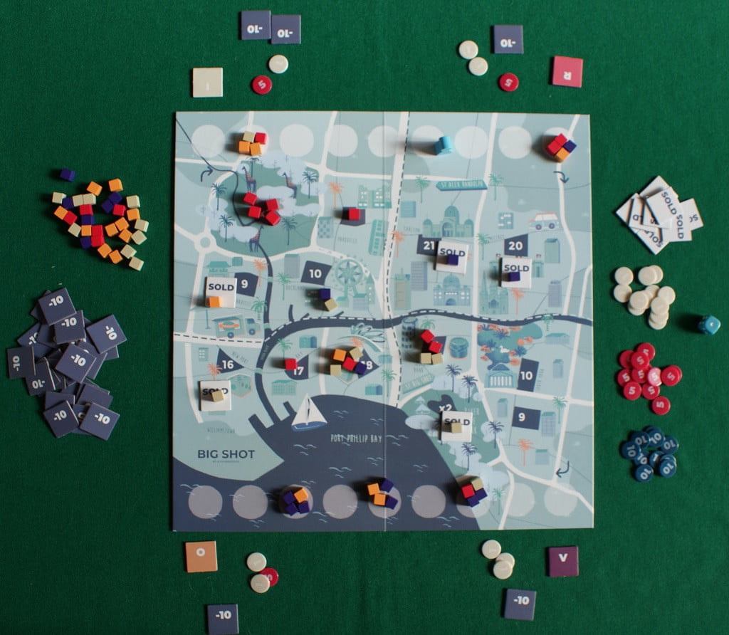 Preparare la tavola per Big Shot è estremamente veloce: si mette il tabellone al centro, si riempiono i 18 cerchietti stampati ai lati opposti della città con quattro cubetti ciascuno (facendo attenzione che in ognuno ci siano almeno due colori diversi), si assegna un “colore” ai giocatori (rosso, viola, arancione o avorio), si danno loro 10 “milioni” in gettoni ed infine si piazza il Broker in una casella qualsiasi