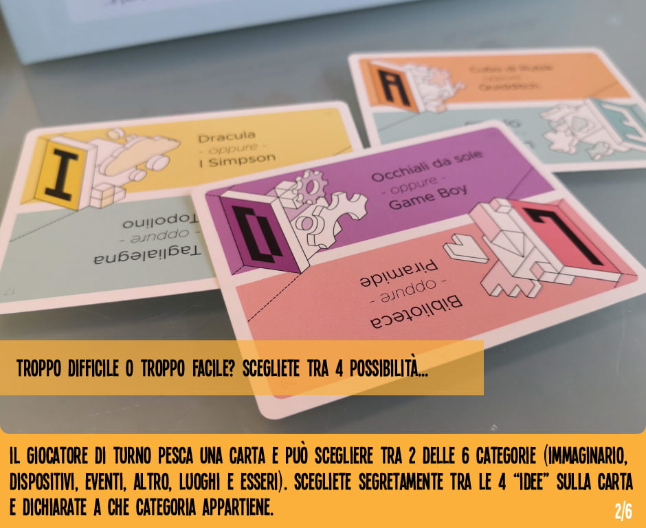 Il giocatore di turno pesca una carta e può scegliere tra 2 delle 6 categorie (Immaginario, Dispositivi, Eventi, Altro, Luoghi e Esseri). Scegliete segretamente tra le 4 “idee” sulla carta e dichiarate a che categoria appartiene.