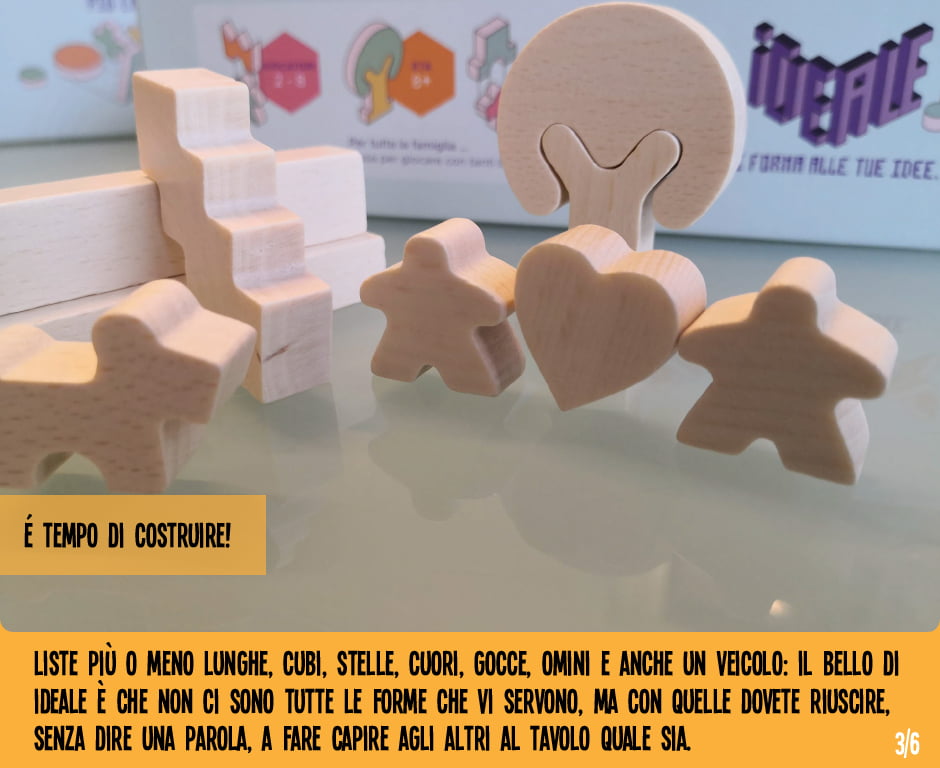 Liste più o meno lunghe, cubi, stelle, cuori, gocce, omini e anche un veicolo: il bello di IDEALE è che non ci sono tutte le forme che vi servono, ma con quelle dovete riuscire, senza dire una parola, a fare capire agli altri al tavolo quale sia.