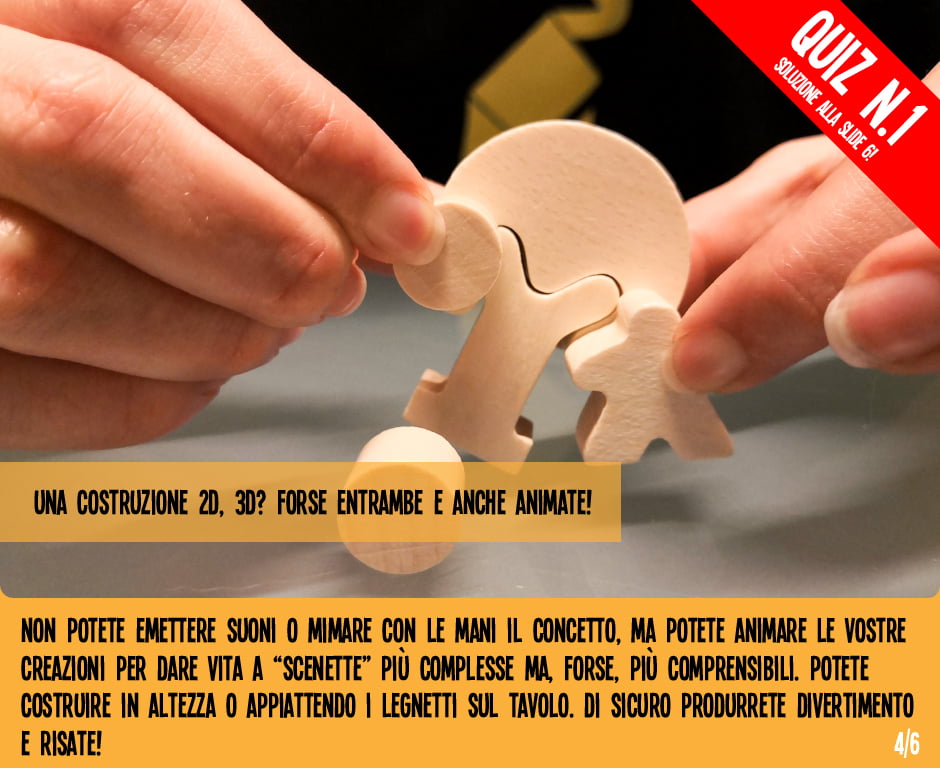 Non potete emettere suoni o mimare con le mani il concetto, ma potete animare le vostre creazioni per dare vita a “scenette” più complesse ma, forse, più comprensibili. Potete costruire in altezza o appiattendo i legnetti sul tavolo. Di sicuro produrrete… divertimento e risate!