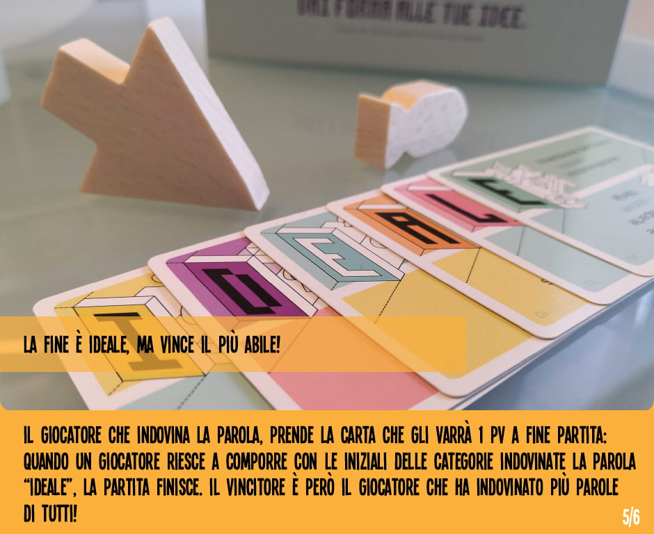 Il giocatore che indovina la parola, prende la carta che gli varrà 1 PV a fine partita: quando un giocatore riesce a comporre con le iniziali delle categorie indovinate la parola “IDEALE”, la partita finisce. Il vincitore è però il giocatore che ha indovinato più parole di tutti!