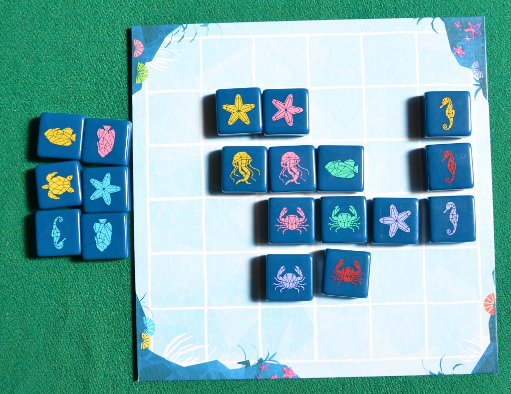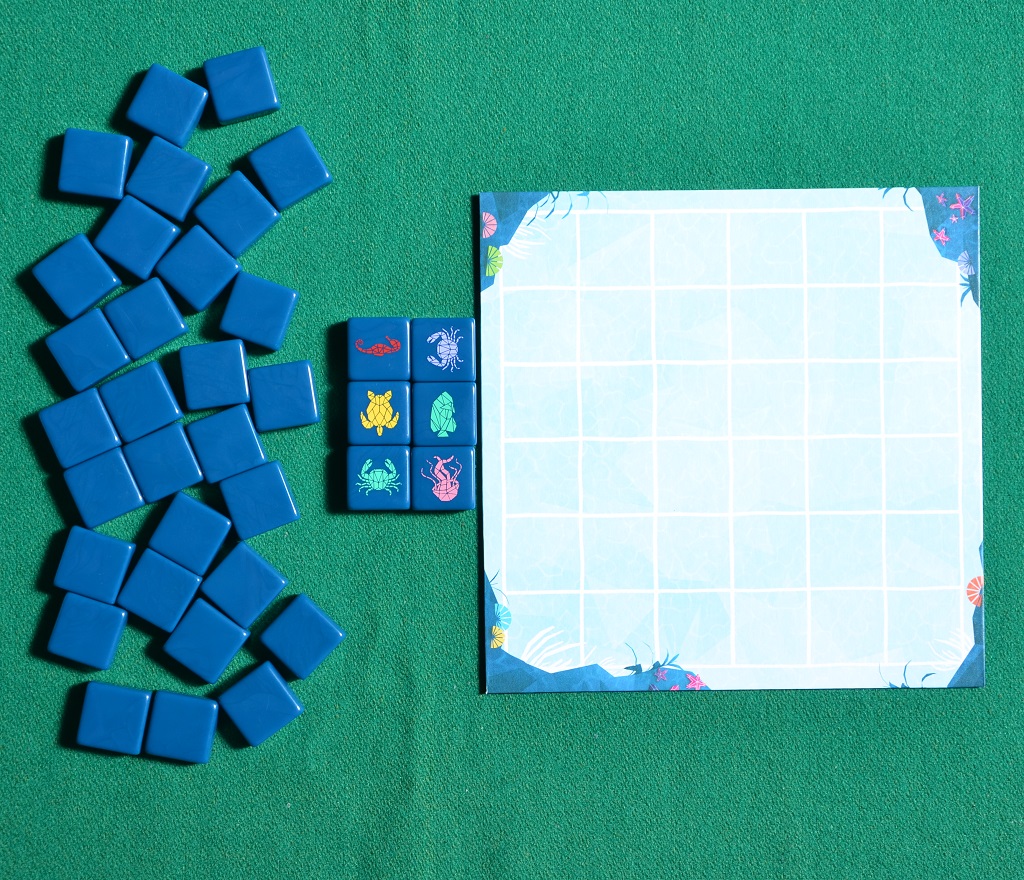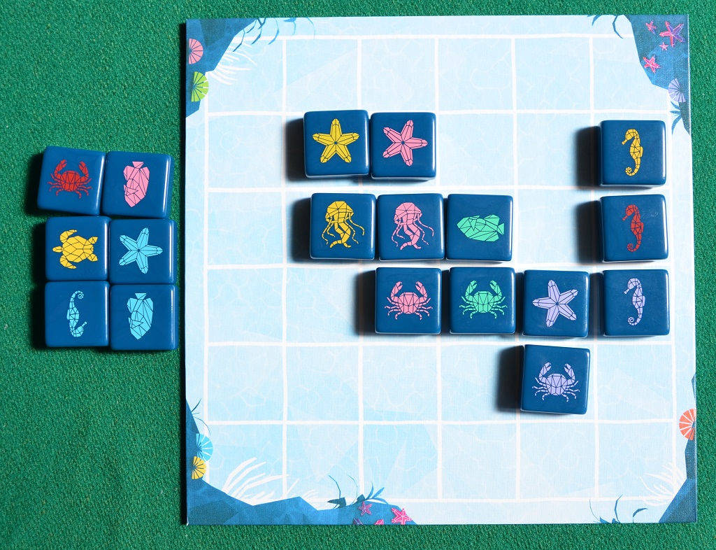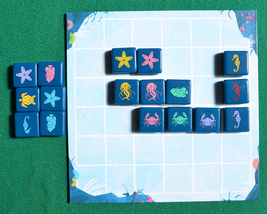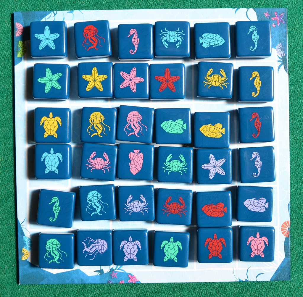 Aprendo la scatolina di Aqualin (solito formato dei giochi Kosmos di questa gamma) troviamo un piccolo tabellone (la barriera corallina, con una griglia di 6×6 quadrati) e 36 tessere di plastica dura di colore blu mare (e come poteva essere altrimenti?) su ognuna delle quali è stampato il disegno di una creatura (tartaruga, medusa, pesce, stella marina, granchio e cavalluccio marino) in sei diversi colori (blu, verde, rosa, viola, rosso e giallo). I materiali sono di buona fattura e le tessere (dei blocchetti di 24x24x9 mm) si possono manipolare senza problemi e con un indubbio… piacere tattile.