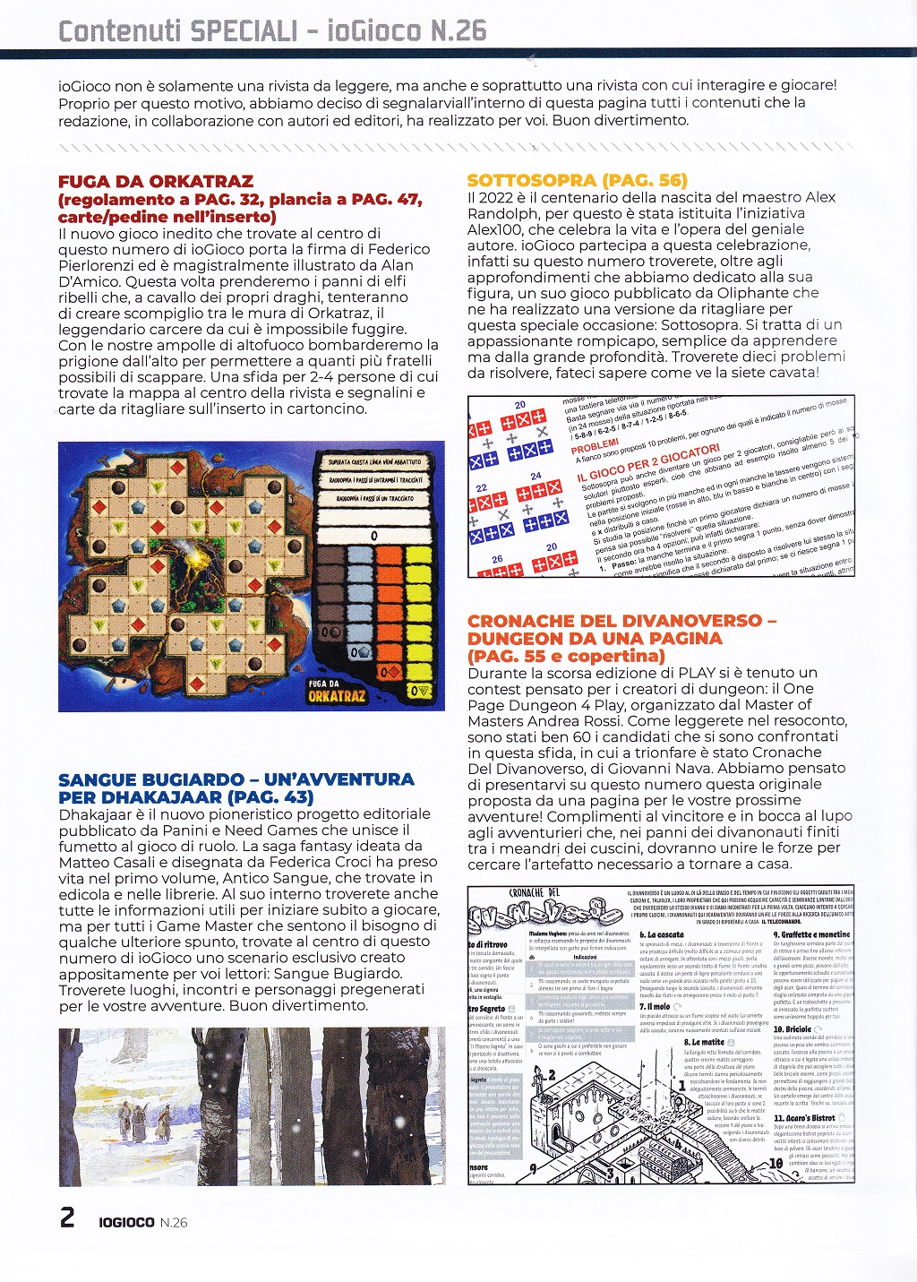 Potete vedere nell’immagine qui sopra cosa ci viene proposto in questo numero sotto la voce “contenuti speciali”: da notare in particolare il gioco completo Fuga da Orkatraz, un’avventura per il gioco di ruolo Dhakajaar, il mini-game Sotto Sopra di Alex Randolph e uno scenario ideato in occasione del “Master of Masters” e chiamato Cronache del Divanoverso.