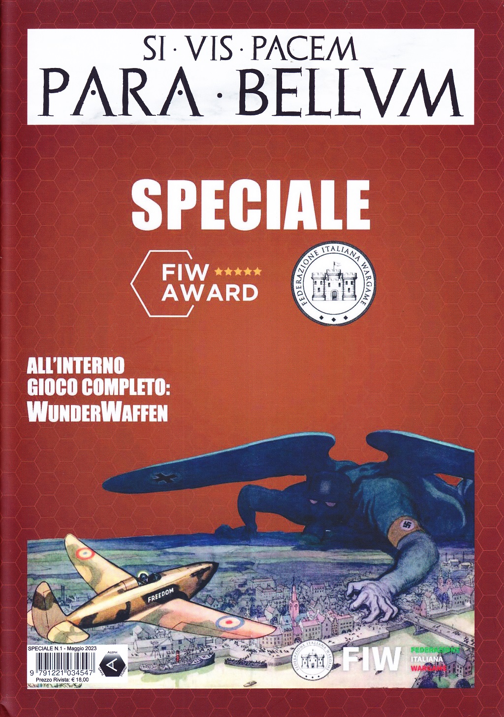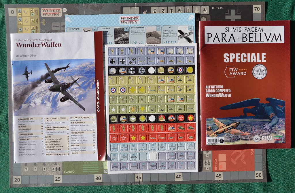 Questo numero “Speciale” però è davvero molto particolare perché è dedicato interamente alla Federazione Italiana Wargame (FIW), al suo “concorso” (FIW AWARD) per la creazione di wargames italiani: ne sono arrivati una ventina e un giuria di esperti giocatori ha dovuto provarli tutti per selezionare un vincitore. Alla fine ha prevalso il gioco WunderWaffen di Walter Obert che ha ricevuto l’ambito premio… che consiste appunto nella pubblicazione del suo gioco, grazie alla redazion3 di Para Bello ed alla casa editrice Aleph Game Studio di Reggio Emilia che hanno pensato alla realizzazione.