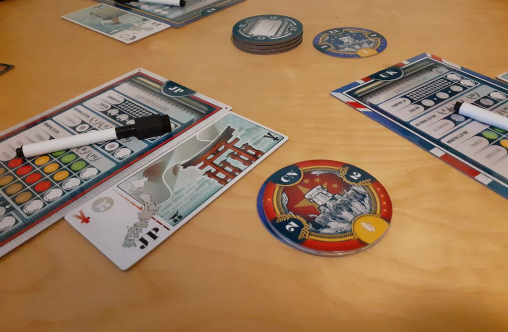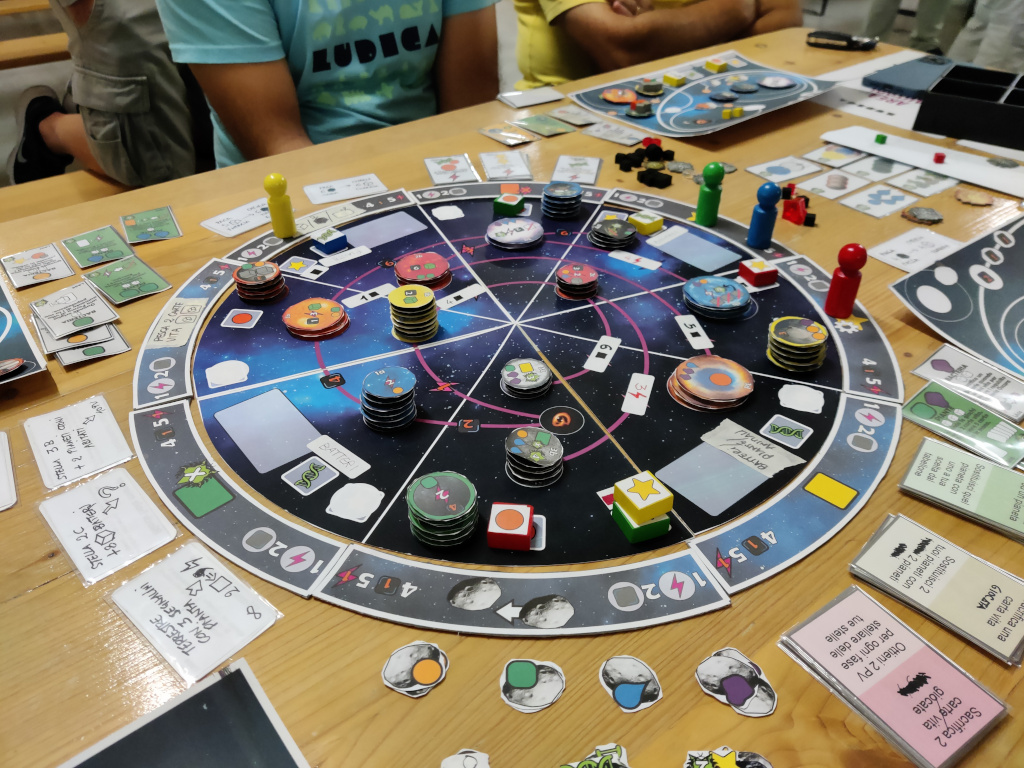 Appena arrivato trovo già pronto per partire un tavolo di Cosmic, prototipo di Nestore Mangone, Simone Luciani e Tommaso Battista, spiegato dallo stesso Battista che ha anche giocato con noi. Ci troviamo di fronte ad un german di peso medio alto, per giocatori esperti, che tratta di cosmogonia, con la plancia dei giocatori che rappresenta una galassia in evoluzione. Il tabellone comune è una rondella suddivisa in settori, sulla quale svolgiamo azioni che possono richiedere la spesa di un token personale, il quale rimarrà bloccato in quella posizione finché non avremo raggiunto nuovamente quello specifico settore con un giro completo. Le azioni ci permettono di accrescere le stelle, di formare pianeti e di far nascere la vita su questi ultimi, dai batteri alle forme animali. Il gioco mi ha lasciato un’ottima prima impressione, dalle tante strade per conseguire la vittoria all’interazione apparentemente bassa ma comunque non distruttiva, per non parlare delle combo risorse-azioni che danno molta soddisfazione una volta che il proprio motore entra a regime.