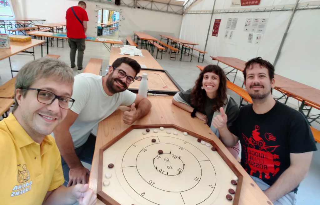 Passando dai Dexterity Games non potevo non fermarmi a provare quello che in poco tempo è diventato il mio preferito della categoria, soprattutto se giocato in 4. Gioco di schicchere in cui bisogna ottenere le posizioni migliori all’interno di un grande bersaglio a cerchi concentrici, con l’obbligo di colpire sempre almeno un pezzo avversario per evitare che il proprio venga eliminato. Interessante il fatto che il punteggio venga calcolato come differenza tra quello delle due squadre: un round perfetto può consentire grandi rimonte.