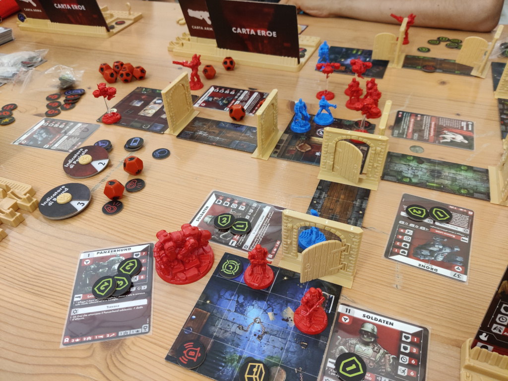 L’ultimo titolo che riesco a provare è Wolfenstein, nell’area “videogiochi da tavolo”. Tratto dal celebre sparatutto, impersoniamo un manipolo di soldati speciali atti a contrastare le forze dell’Asse in un mondo in cui esse hanno vinto la Seconda Guerra Mondiale. Troveremo robot e soldati zombi da abbattere a suon di dadi, equipaggiamenti dai molteplici effetti, esplorazione e obiettivi da perseguire, ma soprattutto un sistema generale semplice e, tutto sommato, abbastanza dinamico. Un american al 200%, per gli appassionati del genere.